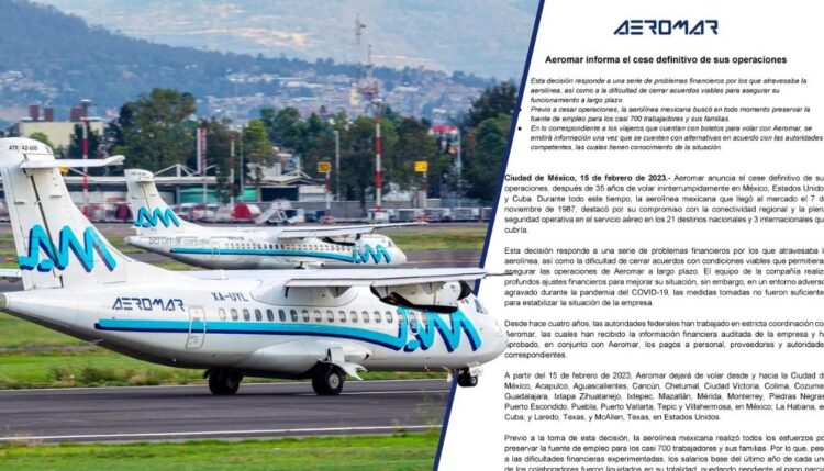 A través de un comunicado, la aerolínea afirmó que el fin de sus actividades se da, además de sus problemas financieros, a causa de “la dificultad de cerrar acuerdos con condiciones viables que permitieran asegurar las operaciones de Aeromar a largo plazo”.