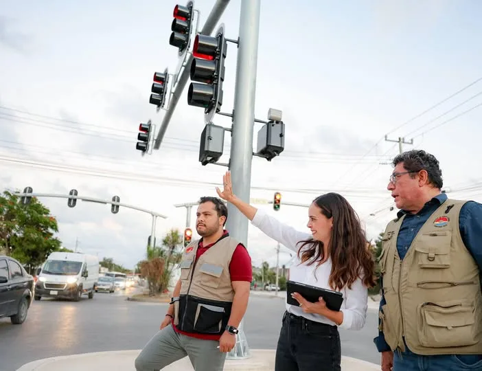 En un recorrido por la intersección de avenida Orquídeas con avenida Lak’in, la alcaldesa constató que la modernización del sistema de semáforos registra un 58 por ciento de avance, reflejo del ritmo sostenido con el que se ejecuta este proyecto integral.