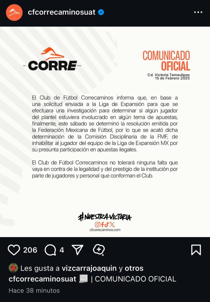 José Vázquez Ávila, señaló además que la FMF ha advertido a todos los clubes que, si se detecta otro caso de manipulación de partidos, los equipos involucrados podrían ser desafiliados. La Comisión Disciplinaria de la Federación Mexicana de Futbol informa que realizó una investigación de oficio por posible manipulación de partidos correspondientes a la Temporada 2024-2025 en la LIGA Expansión MX y Liga Premier.